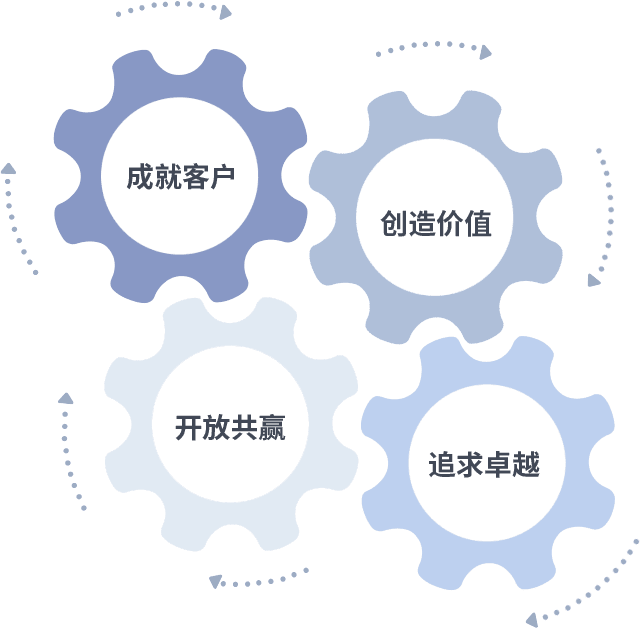 成就客户是一切决策的出发点,,创造价值是衡量所有工作的标准,,,,追求卓越是我们做事做人的态度,,开放共赢是我们的格局也是最终的结果。。价值观的齿轮环环相扣,,,,推动着组织里的每个人不断向前。。。。
